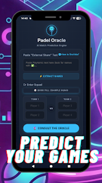 Padel Oracle : Prédicteur de Match fonctionne sur Android 15.0 ou supérieur. La version actuelle du programme est 4.0, et vous ne pouvez l'exécuter qu'en anglais.